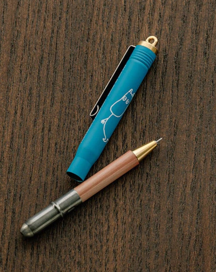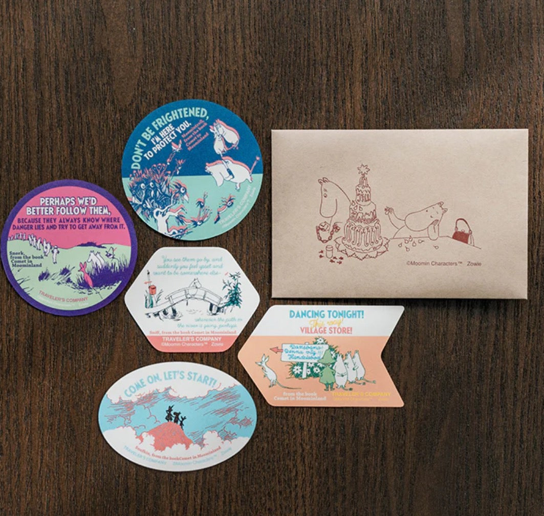 It comes with a ballpoint pen, original refill, and 5 stickers depicting scenes from the novel, all packaged in a box resembling a book. Holding it in your hands allows you to experience the world of "Comet in Moominland" through the Traveler's Notebook and its customization items.