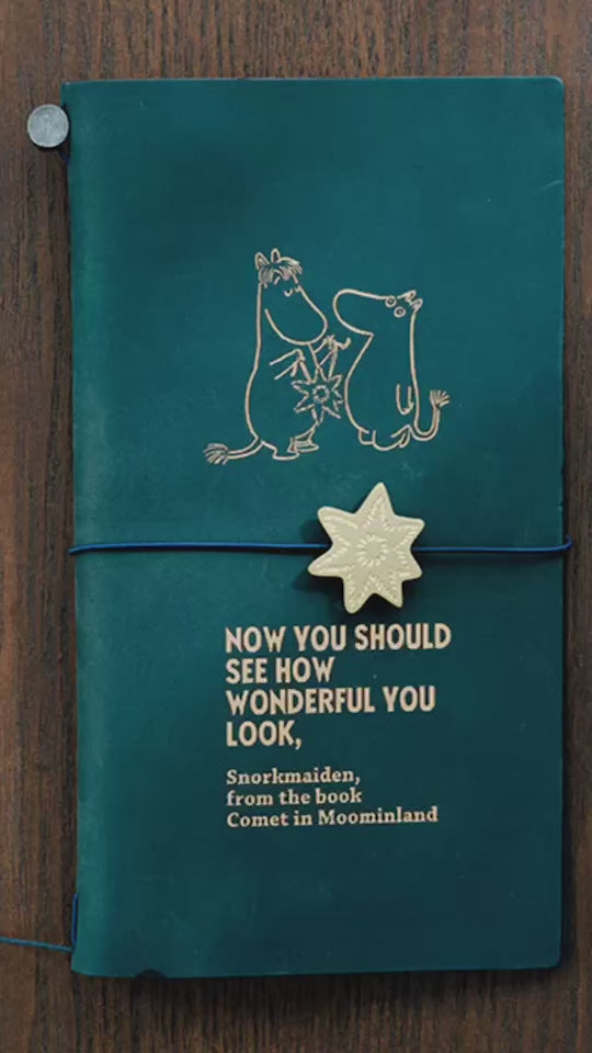 The blue leather cover of the Traveler's Notebook features an embossed scene of Snorkmaiden putting a medal around Moomin's neck.