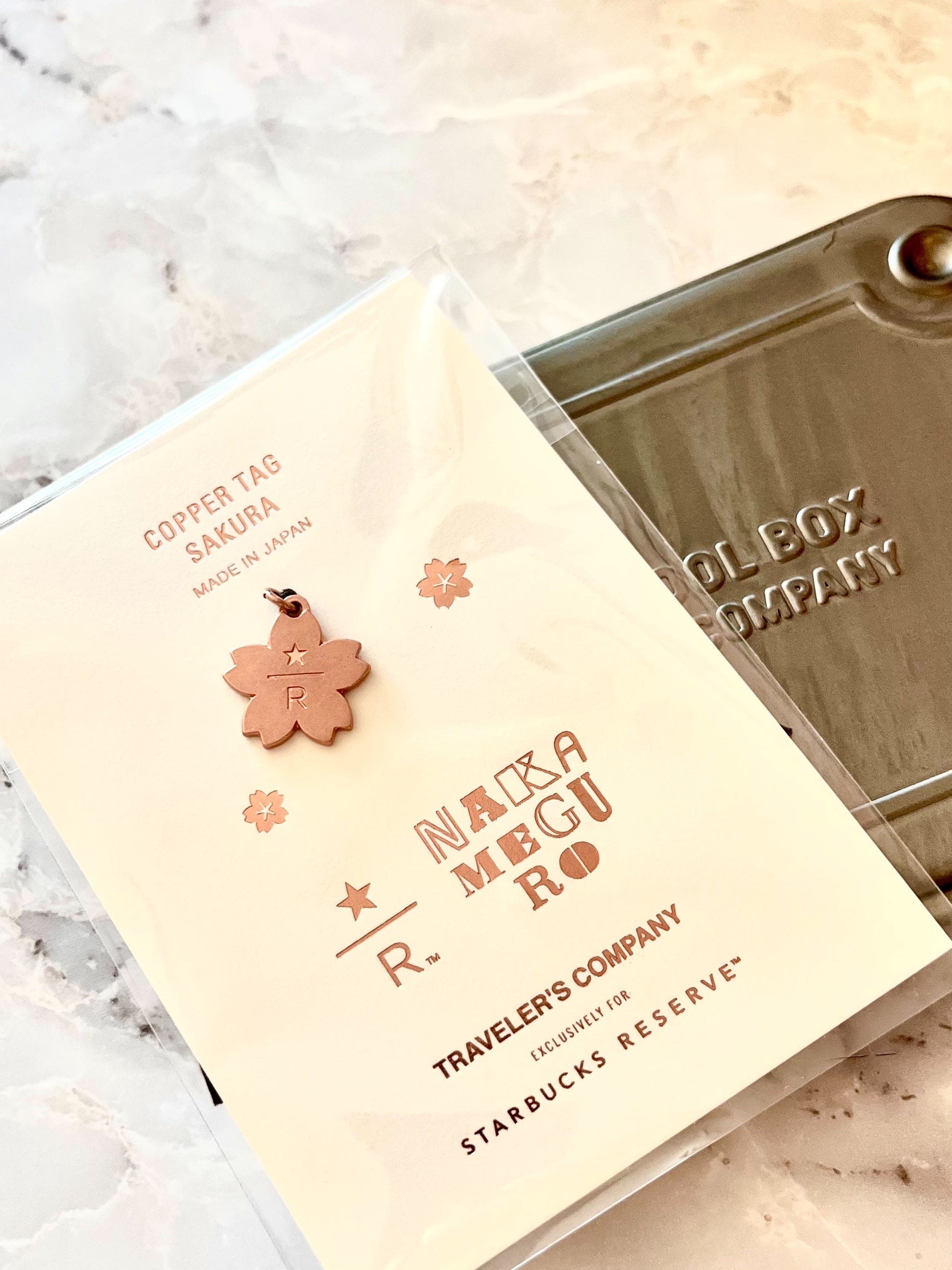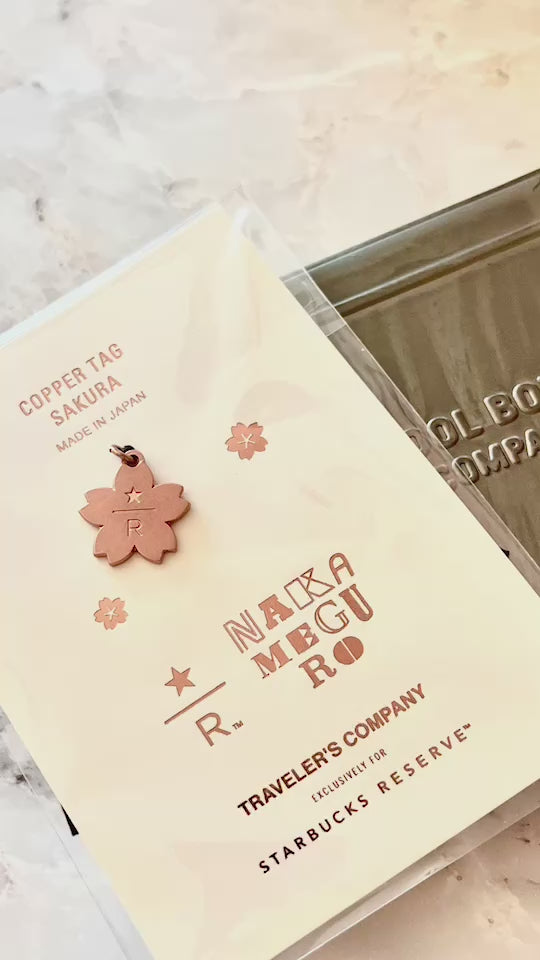 A cherry blossom charm you'd want to adorn your Traveler's Notebook with. A copper charm designed to customize your Starbucks Reserve Roastery Traveler's Notebook. This charm is inspired by the cherry blossom decorations on the copper casks at Roastery Tokyo, featuring petal-shaped sakura with an engraved ★/R logo.